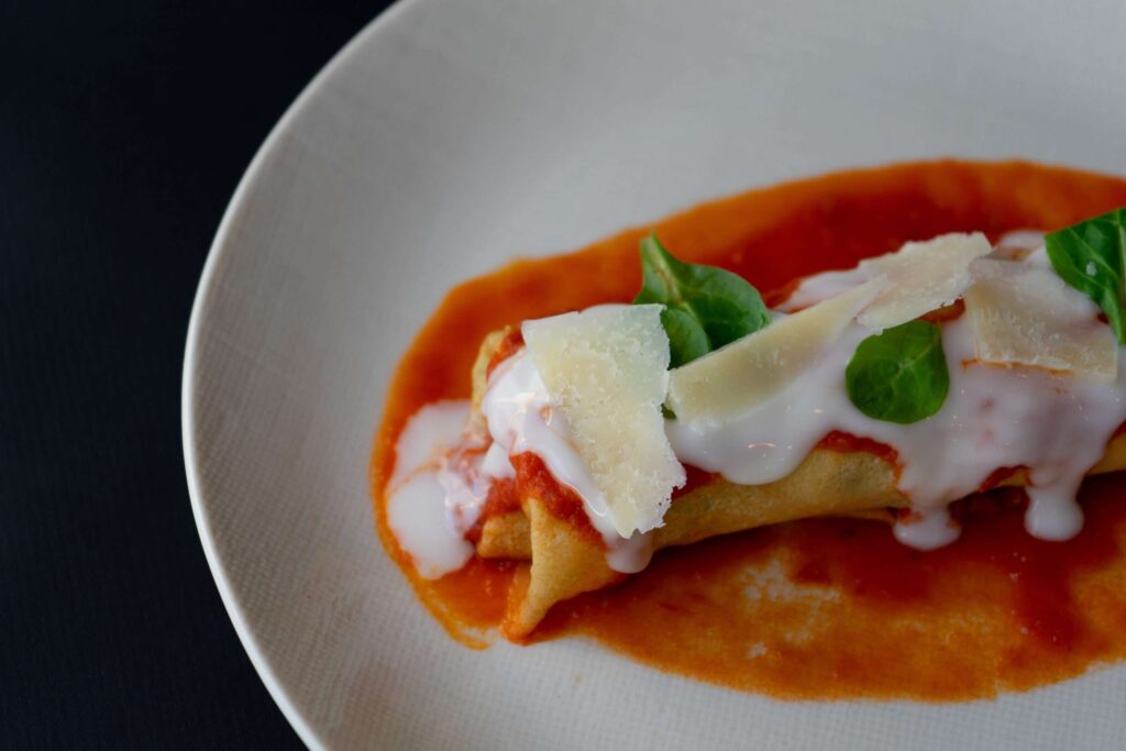 Canelón de filloa con queso fresco y acelgas, bañado en tomate y bechamel, con parmesano y germinados al toque final.