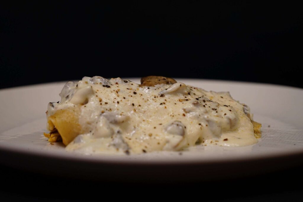 Filloa rechea de polo, bañada en cremosa salsa de champiñóns e un toque de finas herbas