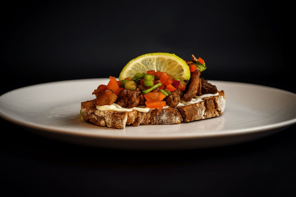 Crocante montaña de chicharrón de porco sobre pan de millo artesanal, coroada con pico de galo e lima fresca.