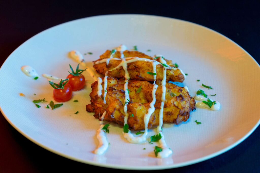 Bacallau desmigado con pataca e ovo, aromatizado con cilantro e especias.