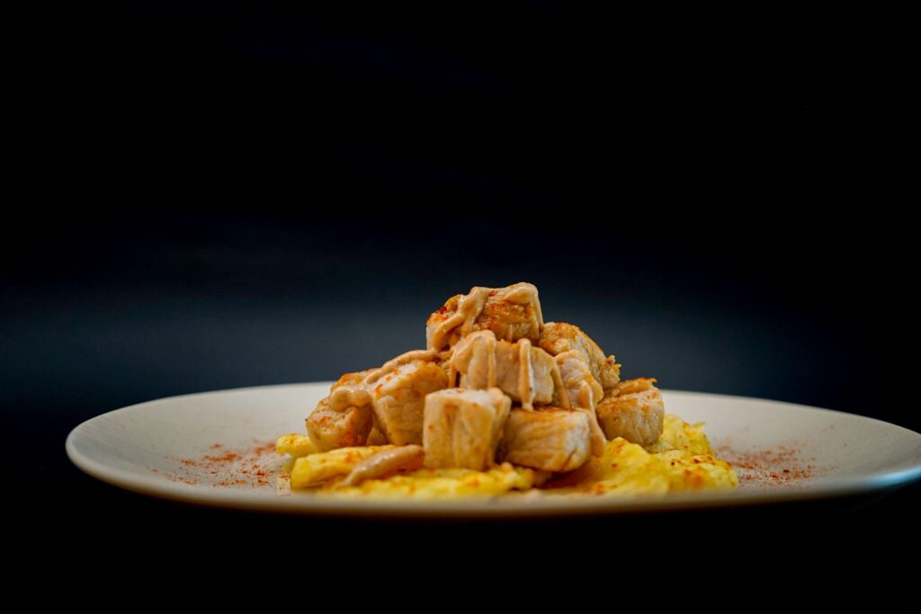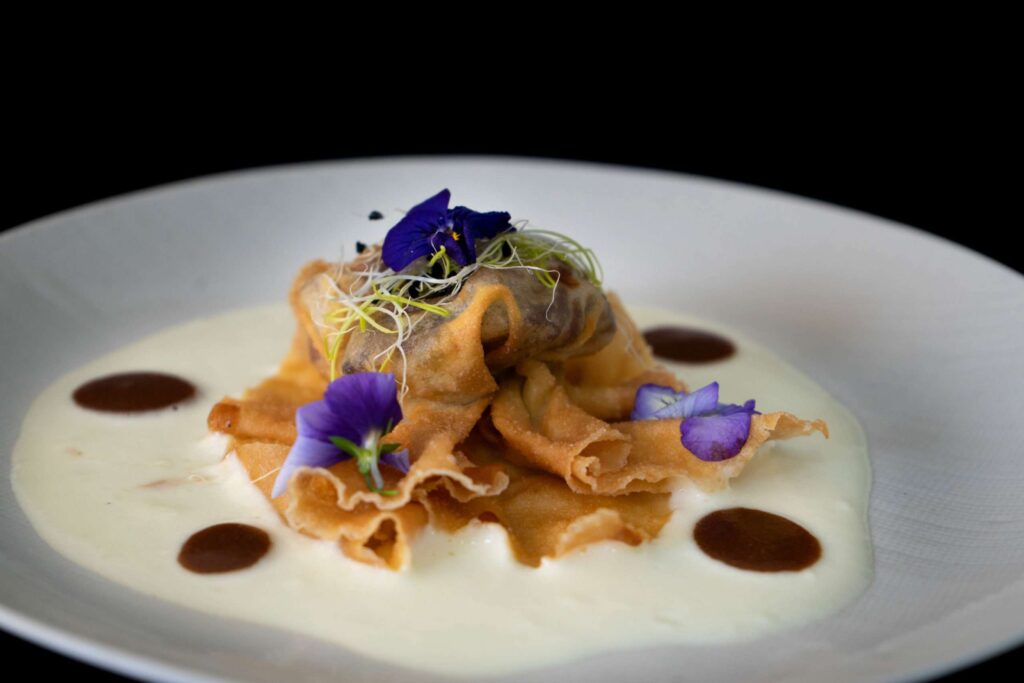Carrilleira de porco Duroc lentamente guisada en viño tinto galego con hortalizas frescas e especias, rematadas con cremoso queixo de Arzúa.