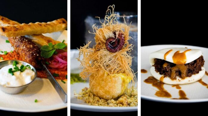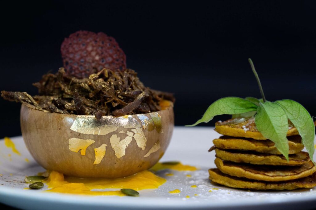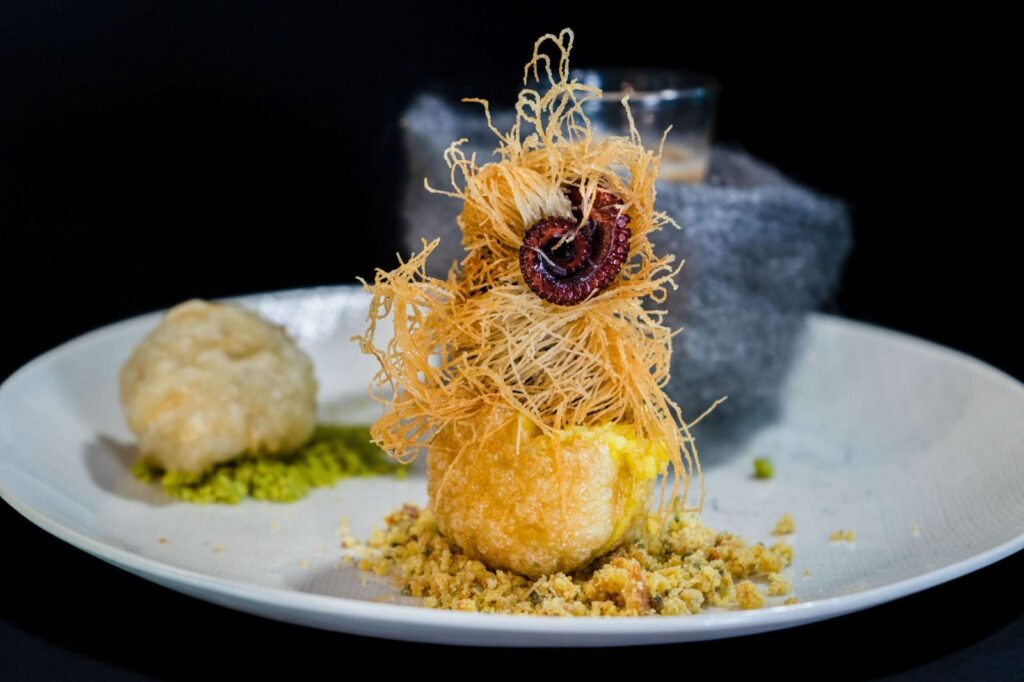 Pulpo katayfi sobre tierra de pan de millo en panipuri con crema de patata. Un helado frito de frutas del bosque y un granizado de sol y sombra gallego en nido de fuego.