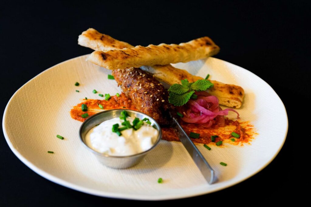 Kafta de tenreira galega especiada ao estilo libanés, acompañada dunha cremosa salsa de iogur e requeixo das Neves para dippear.