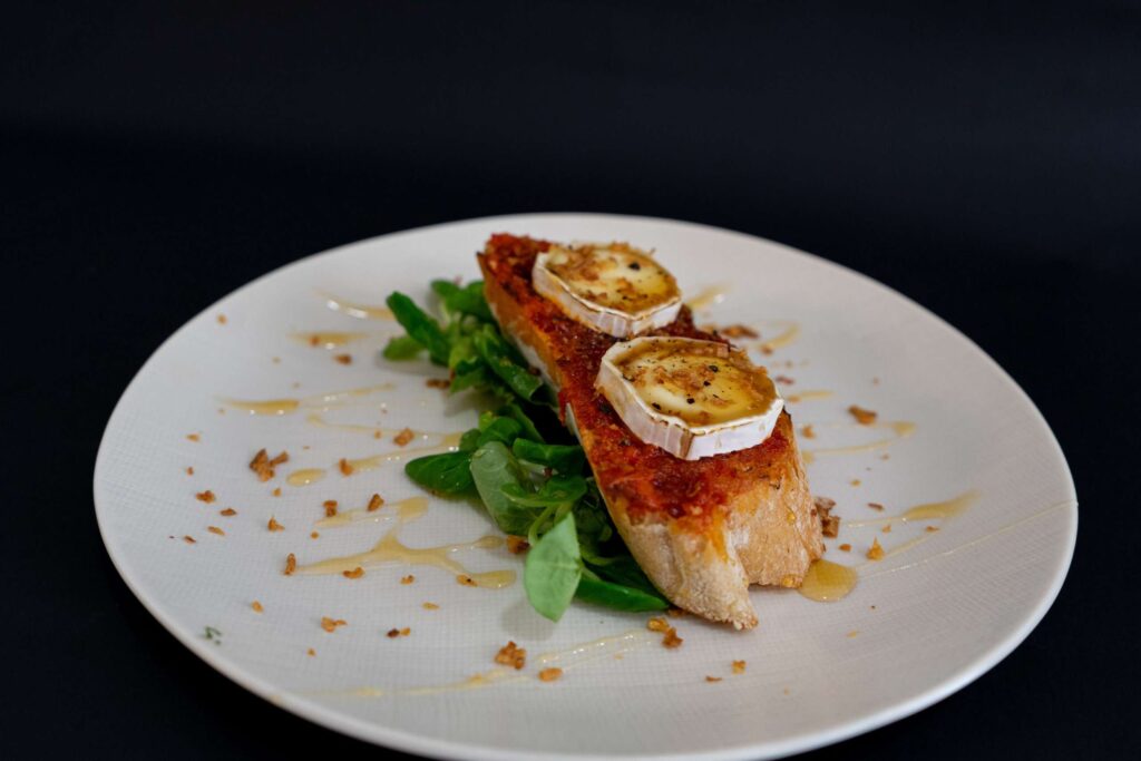 Pincho gourmet de pan torrado de masa nai con sobrasada, rulo de cabra flamexado, un toque de pementa e cebola frita, coroado cun fío de mel da Cañiza.