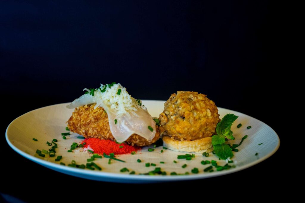 Croqueta de brisket afumado con corazón de marmelada de pementos de Guláns, e outra doce de chocolate con leite envolta en po de rosquilla de Ponteareas. Un contraste entre doce e salgado.