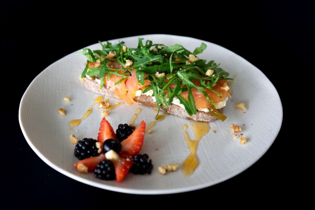 Pan artesá con salmón afumado, queixo cremoso, rúcula e mel.