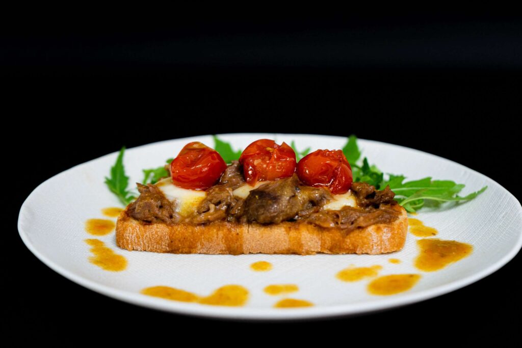Carrilleiras guisadas acompañadas de tomates asados, queixo fundido e rúcula fresca.
