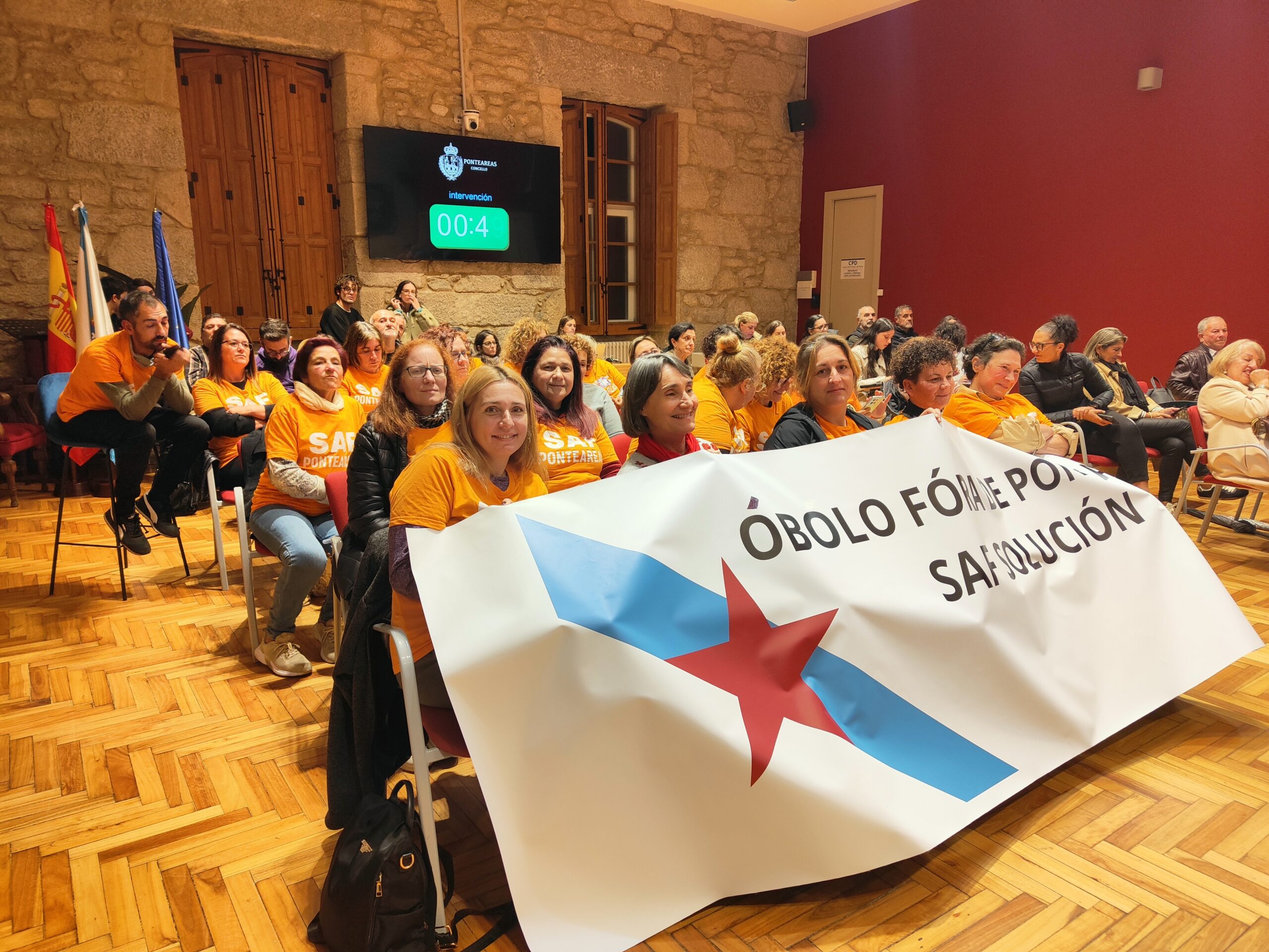 O persoal do Servizo de Axuda no Fogar (SAF) de Ponteareas, en folga indefinida dende o pasado 26 de setembro, vén de iniciar un peche no interior do Concello para reclamar unha solución ao conflito laboral, «que pasa pola rescisión do contrato coa concesionaria Óbolo».Un grupo de traballadoras e de responsábeis da CIG, entre eles o secretario xeral, Paulo Carril, e a secretaria comarcal da CIG-Servizos de Vigo, Transi Fernández, accederon ao consistorio para trasladar as reivindicacións das afectadas durante o pleno da corporación como xa se fixo con anterioridade: que se abonen as nóminas a tempo e que se paguen as horas traballadas, así como medidas de prevención, contratos a tempo completo e que se garantan os descansos legais mínimos, tanto diarios como semanais, entre outras cousas.