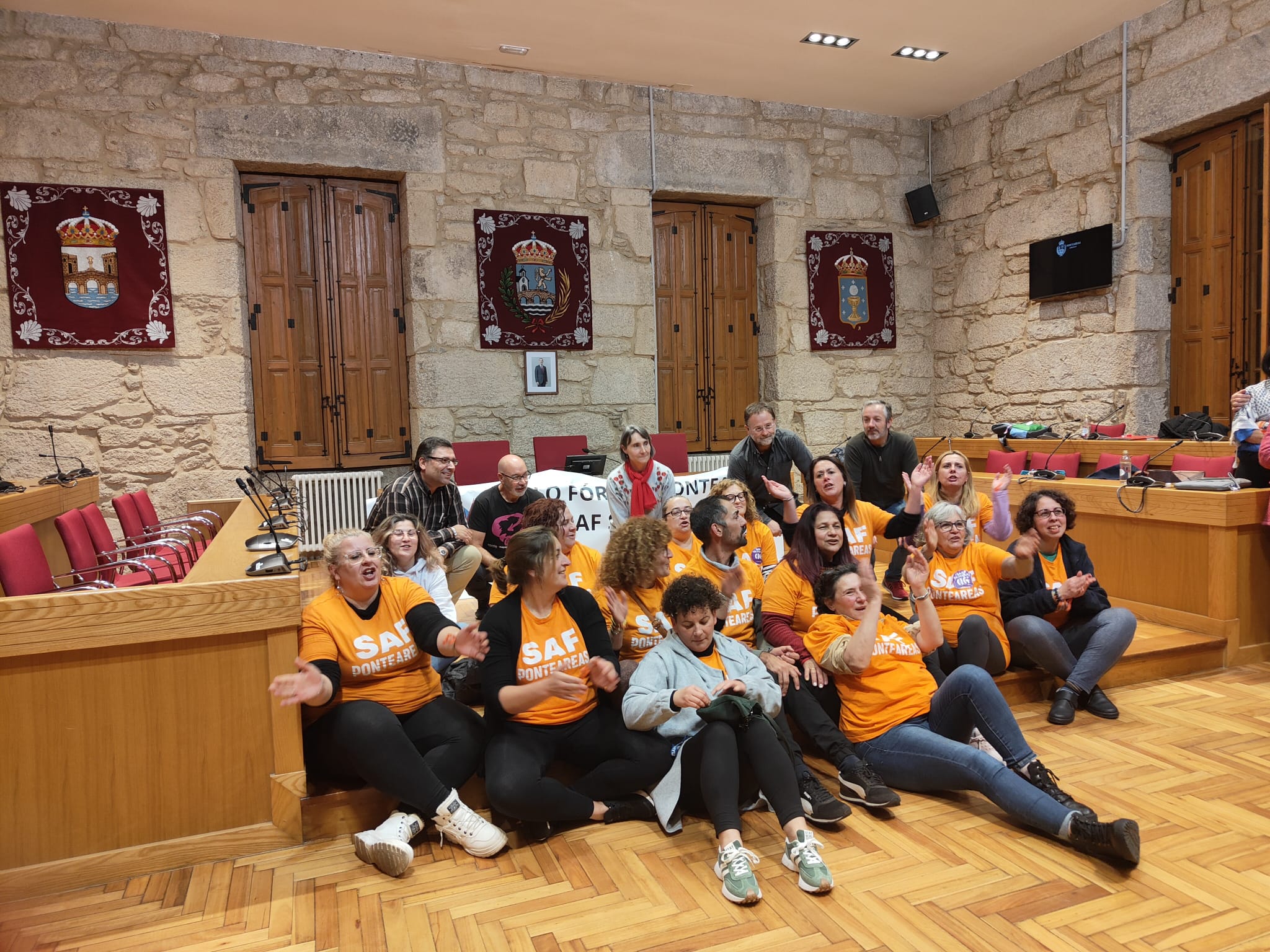 Ao fin da sesión plenaria, na que a corporación abrodou a problemática das traballadoras do SAF e na que o propio goberno municipal, liderado polo Partido Popular, recoñeceu que a empresa caira en «infraccións grave e moi graves», as traballadoras decidiron permanecer no Concello: Pasarían alí a noite.