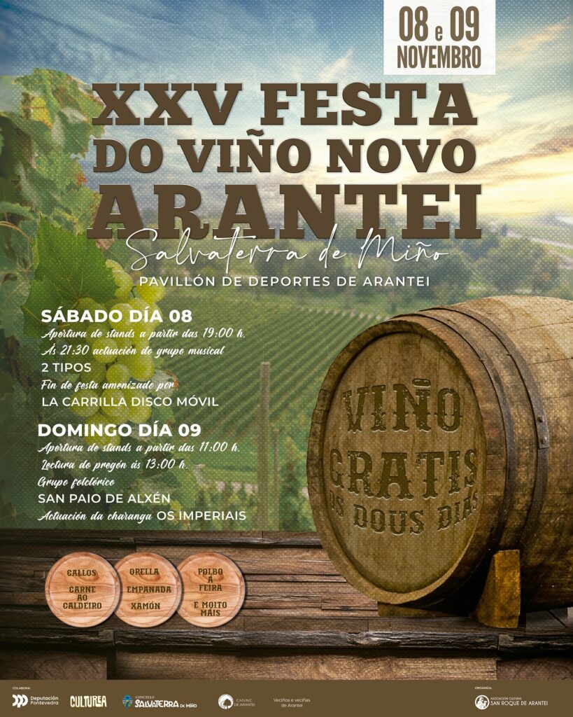 A parroquia salvaterrense de Arantei celebra os días 8 e 9 de novembro a XXV Festa do Viño Novo de Arantei, con degustación de viño gratis, postos gastronómicos e música e animación.