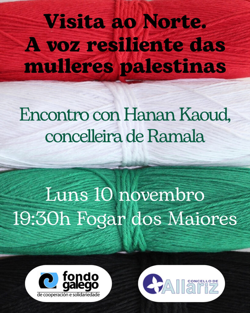 A forza das mulleres palestinas chega ao municipio de Allariz. E é que o vindeiro luns 10 de novembro ás 19:30 horas o Fogar dos Maiores de Allariz acollerá o encontro “Visita ao Norte. A voz resiliente das mulleres palestinas”, unha actividade organizada polo Fondo Galego de Cooperación e Solidariedade coa colaboración do Concello de Allariz, membro da entidade dende hai moitos anos.