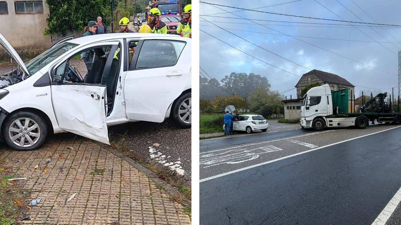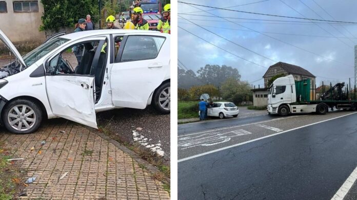 O reloxo marcaba ás 9:30 horas desta maña, cando o 112 recibía o aviso dunha colisión entre un coche e un camión na PO-403, entre o kilómetro 1 e 2, no Concello de Salvaterra de Miño.