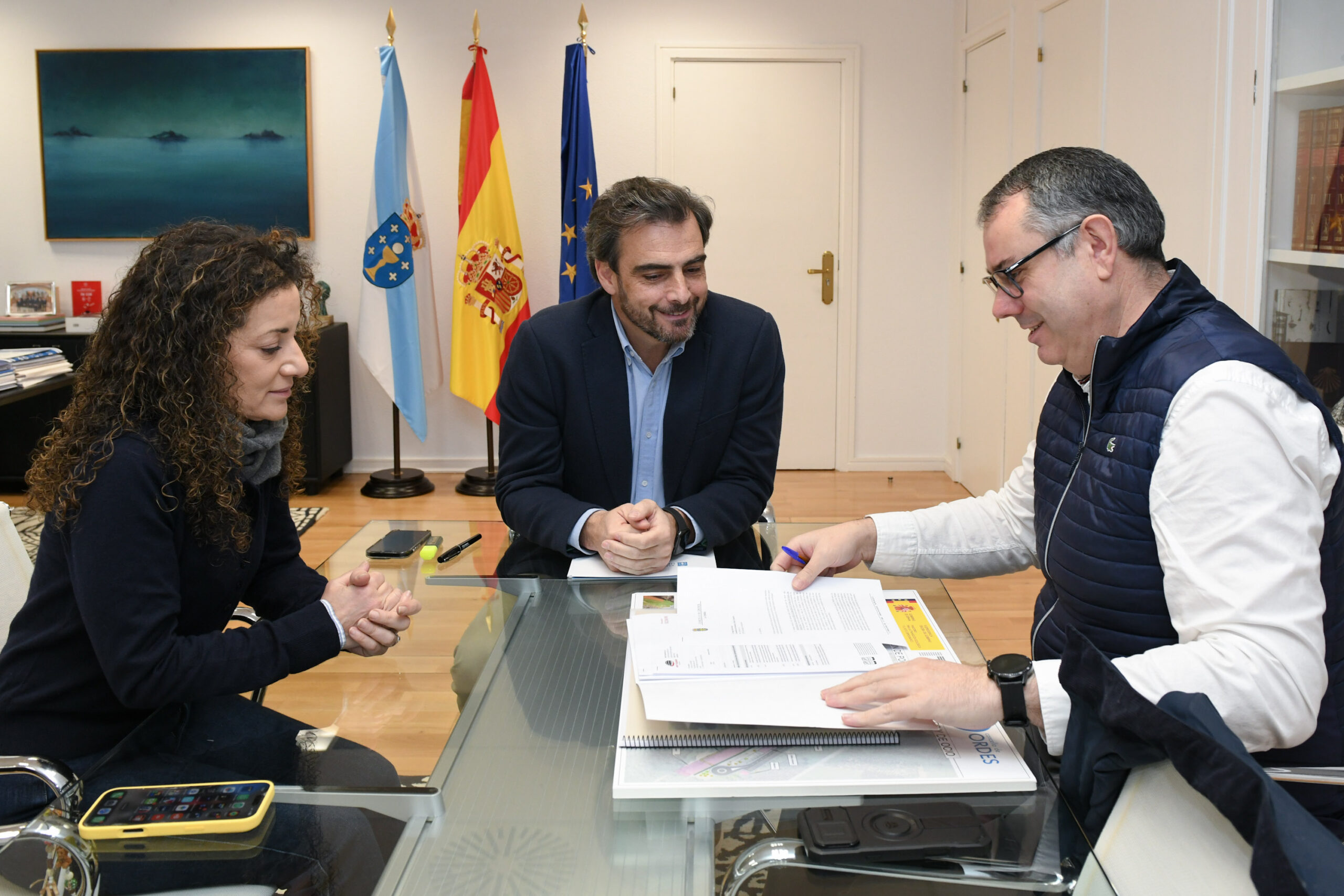 O conselleiro de Presidencia, Xustiza e Deportes, Diego Calvo, mantivo senllas reunións coa alcaldesa de Ribeira, María Sampedro, e co alcalde de Ordes, José Luis Martínez Sanjurjo, e a concelleira de Política Social, Igualdade, Diversidade Educación e Traballo e presidenta da Mancomunidade de Concellos da Comarca de Ordes, Susana García.