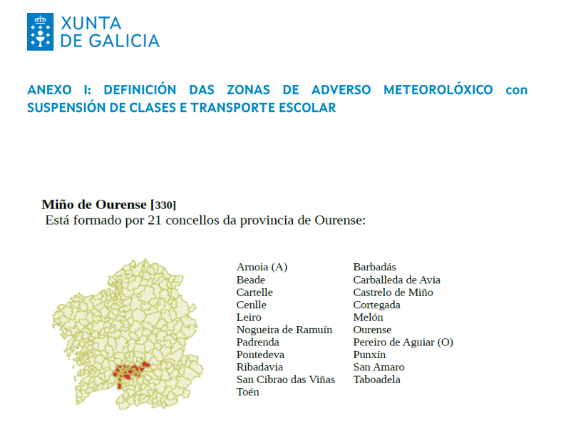 Debido á alerta laranxa por neve decretada polos organismos predictores, a Comisión Escolar de Alertas decidiu suspender as clases e o transporte durante toda a xornada de mañá venres 23 nos centros educativos e nas escolas infantís de toda a provincia de Ourense e das zonas montaña, sur e centro de Lugo e interior de Pontevedra.