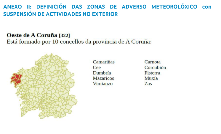 Así mesmo, debido a alerta vermella por fenómenos costeiros, no día de mañá quedan suspendidas as actividades no exterior dos centros educativos das zonas noroeste, oeste e suroeste da provincia da Coruña, na Mariña de Lugo e nas zonas de Rías Baixas e Miño na provincia de Pontevedra.