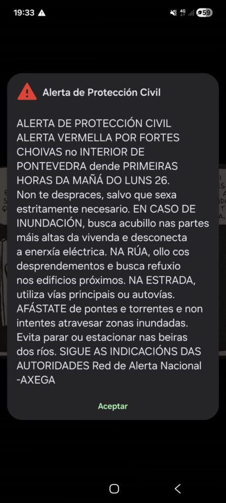 Mensaxe esp-alert recibido hoxe no municipio de Covelo