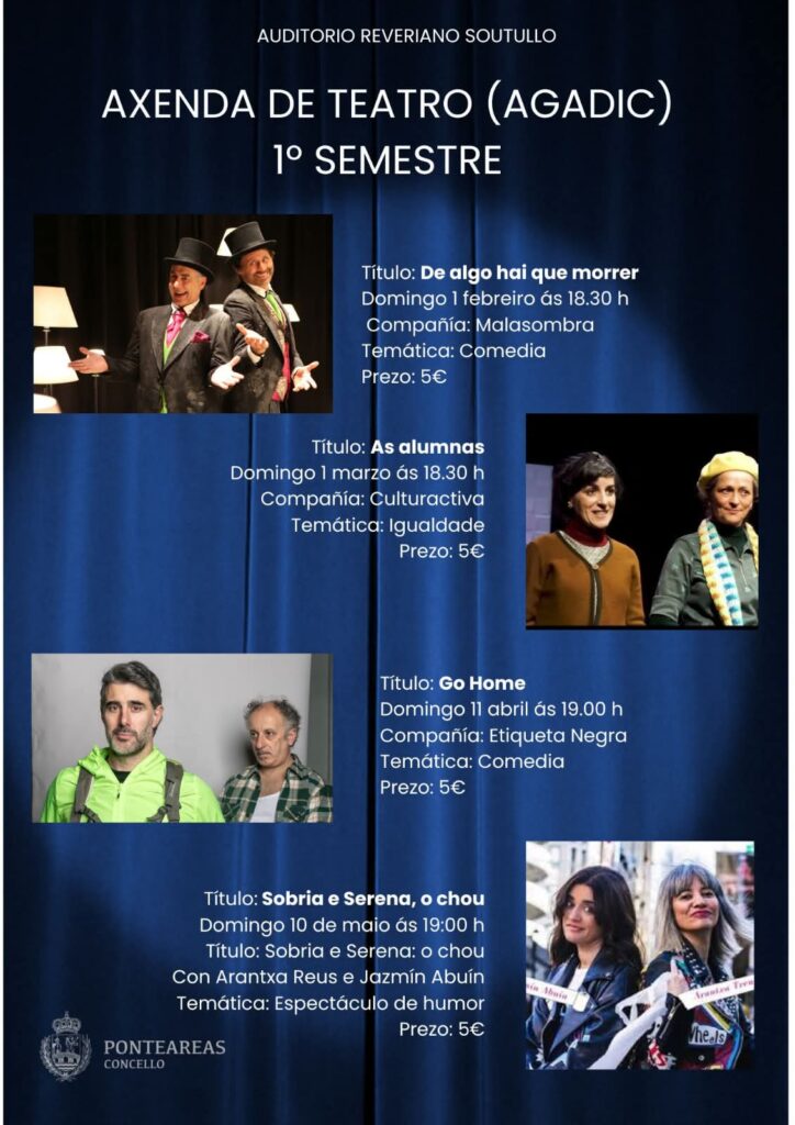 O Concello de Ponteareas vén de publicar, a través da canle oficial da concellería de Cultura que dirixe Juan Carlos González Carrera, a programación do primeiro semestre de teatro no Auditorio Reveriano Soutullo da localidade.