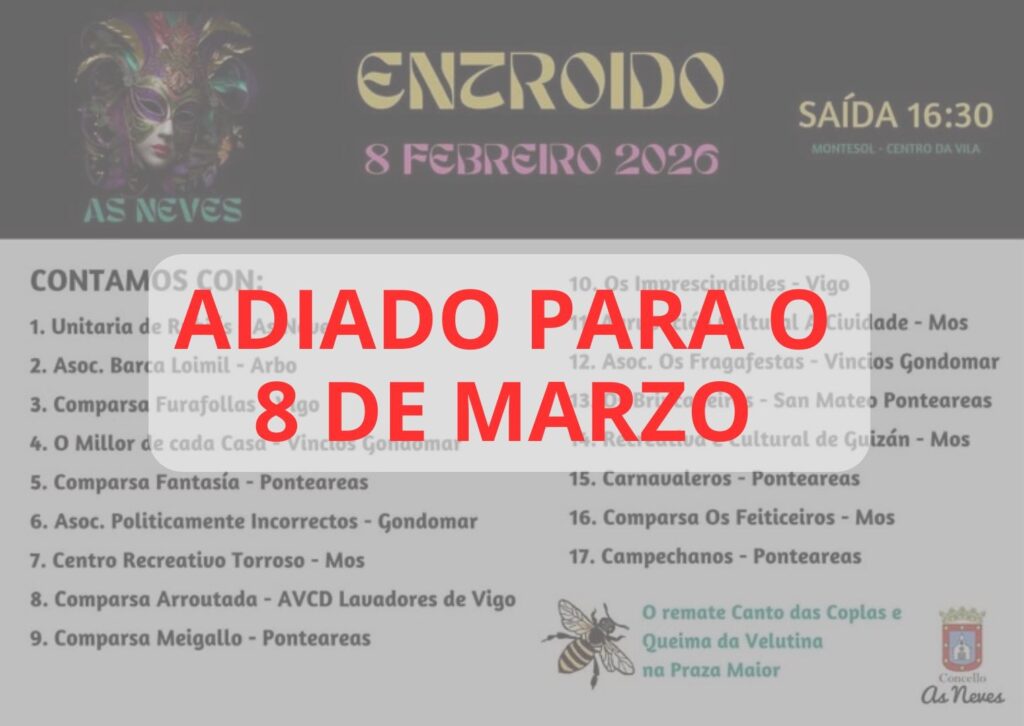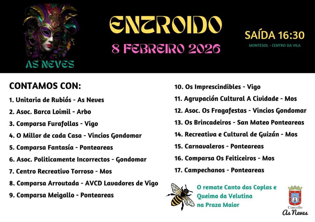 As Neves vén de iniciar xa a súa conta atrás para celebrar o seu Entroido de 2026. O Concello confirma, a través das súas canles oficiais, un “gran desfile” cun total de 17 comparsas así como outros eventos cos que poñer o foco no municipio nun dos días máis agardados polos veciños e as veciñas.