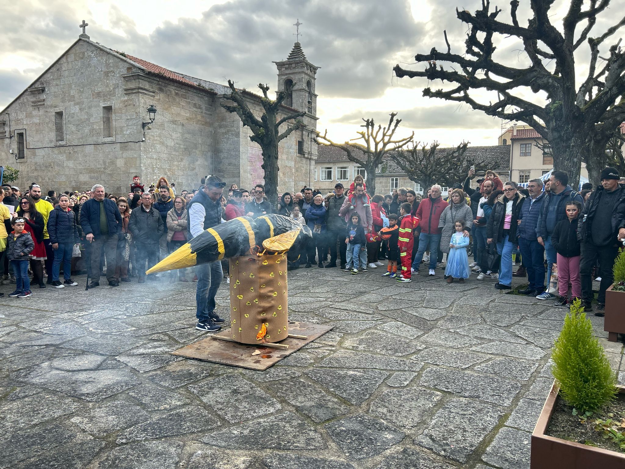 Para pechar o gran día do Entroido 2026 nas Neves, a Praza Maor acollerá a “Queima da Velutina“, un acto que marca o fin da xornada festiva. Trátase dun evento trandicional no que se realiza a queima dunha réplica da Vespa Velutina.