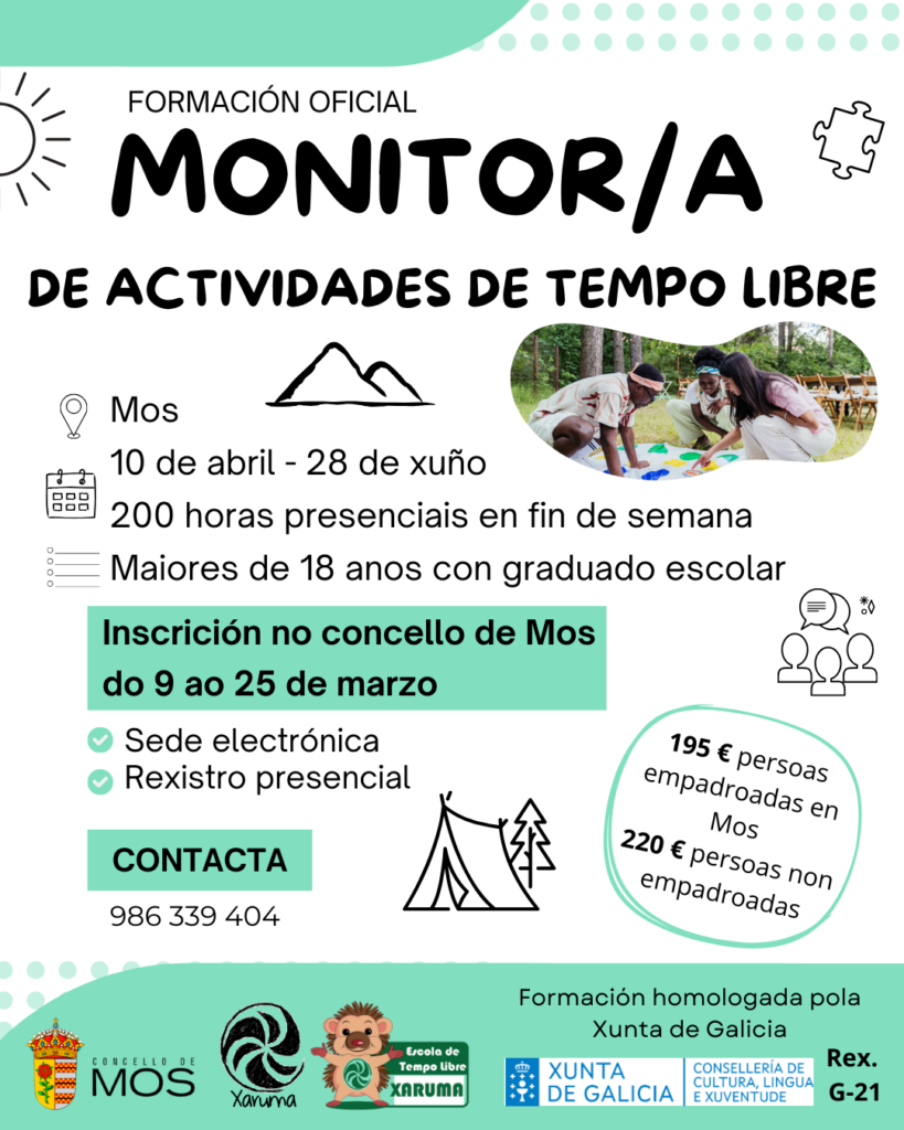 O Concello de Mos abre desde hoxe, luns 9 de marzo, o prazo de inscrición para unha nova edición do curso oficial de Monitor/a de Actividades de Tempo Libre, unha formación dirixida especialmente á mocidade que queira dar o primeiro paso no ámbito da animación sociocultural, o ocio educativo e o traballo con nenos e nenas.